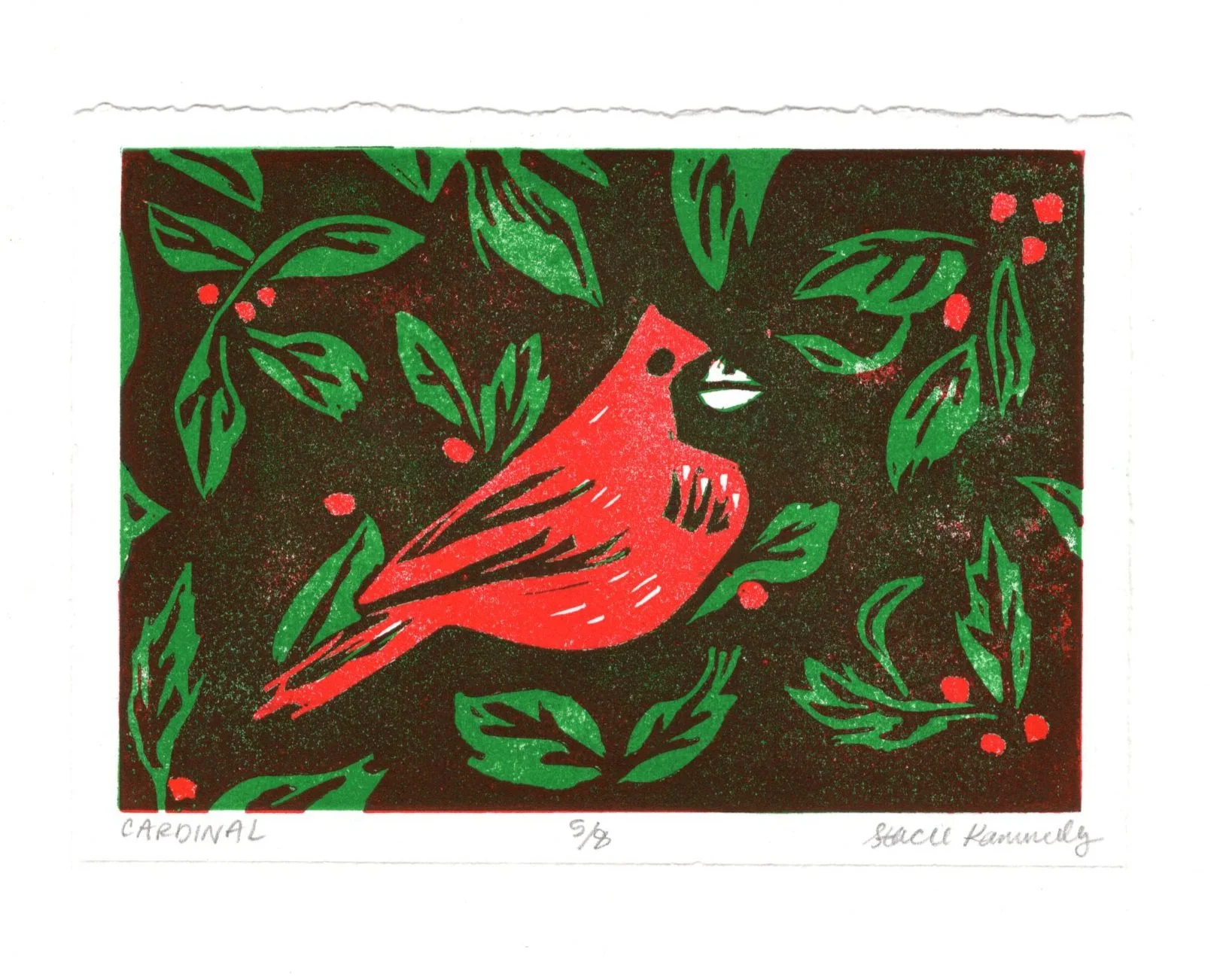 5” x 7” 2-color linocut print for the December pages of the 2025 Cellar Press’ annual community calendar for the Grand Center for Art and Culture in New Ulm. 2024.